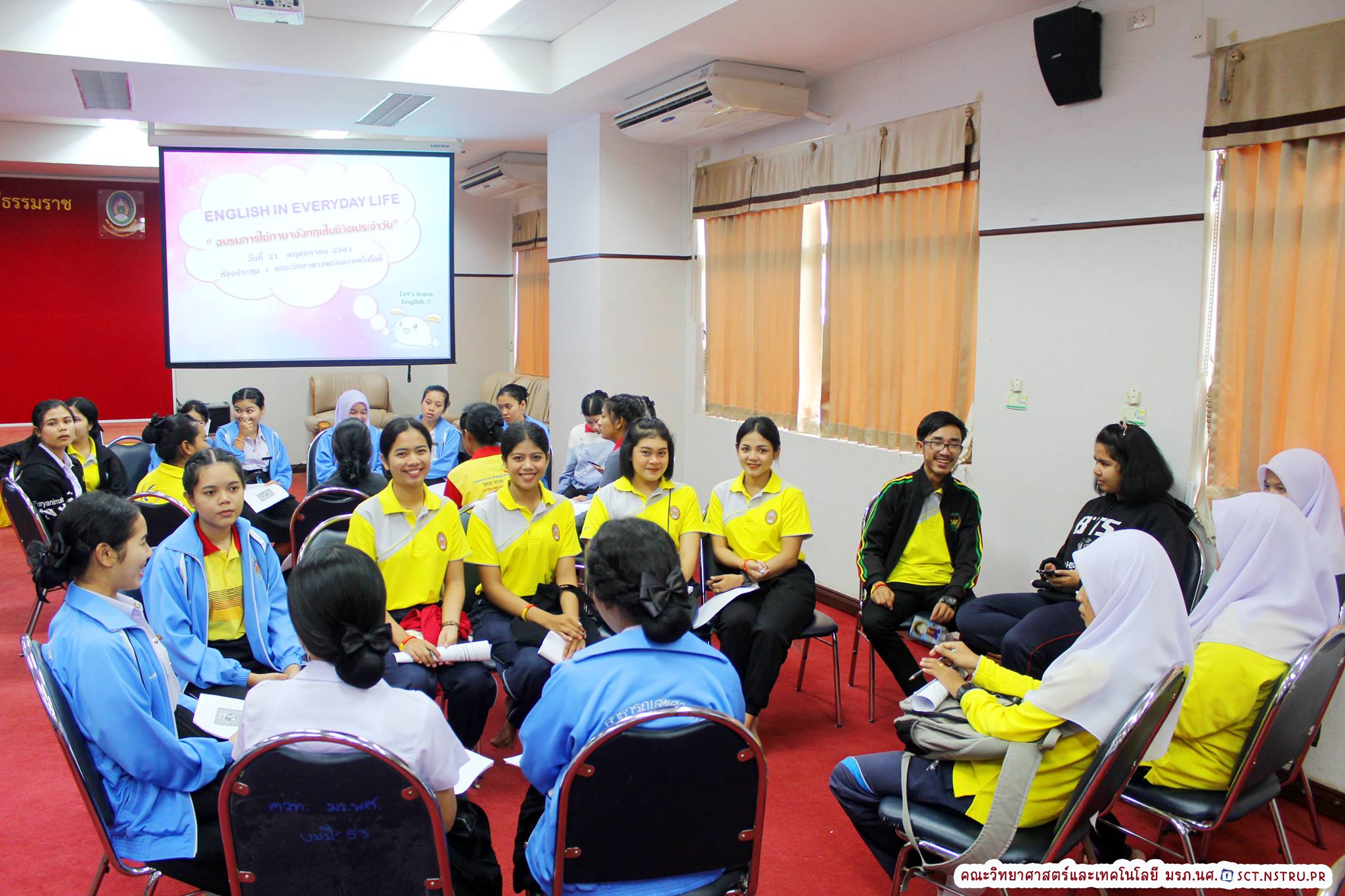 วันพุธที่ 21 พฤศจิกายน พ.ศ.2561 คณะวิทยาศาสตร์และเทคโนโลยี มหาวิทยาลัยราชภัฏนครศรีธรรมราช จัดกิจกรรมอบรมการใช้ภาษาอังกฤษในชีวิตประจำวัน (Enhlish in everyday life) โดยมีวัตถุประสงค์เพื่อฝึกทักษะการพูด การสนทนาในชีวิตประจำวัน ให้กับนักศึกษาชั้นปีที่ 1 โดยได้รับเกียรติจาก Dr.Fahmida Wazed Tina และ Mr.Eyong Valentine เป็นวิทยากรที่มีความเชี่ยญชาญในเรื่องดังกล่าว และได้มี ผศ.ขนิษฐา กีรติภัทรกาญจน์ รองคณบดีฝ่ายวิชาการและกิจการนักศึกษา เป็นผู้กล่าวเปิดกิจกรรม ซึ่งกิจกรรมดังกล่าวมีนักศึกษาเข้าร่วมจำนวน 170 คน ณ ห้องประชุม 1 คณะวิทยาศาสตร์และเทคโนโลยี