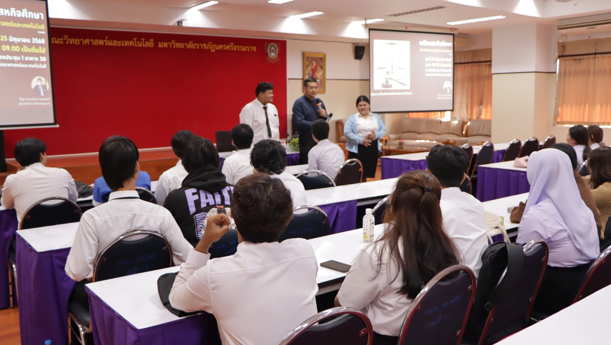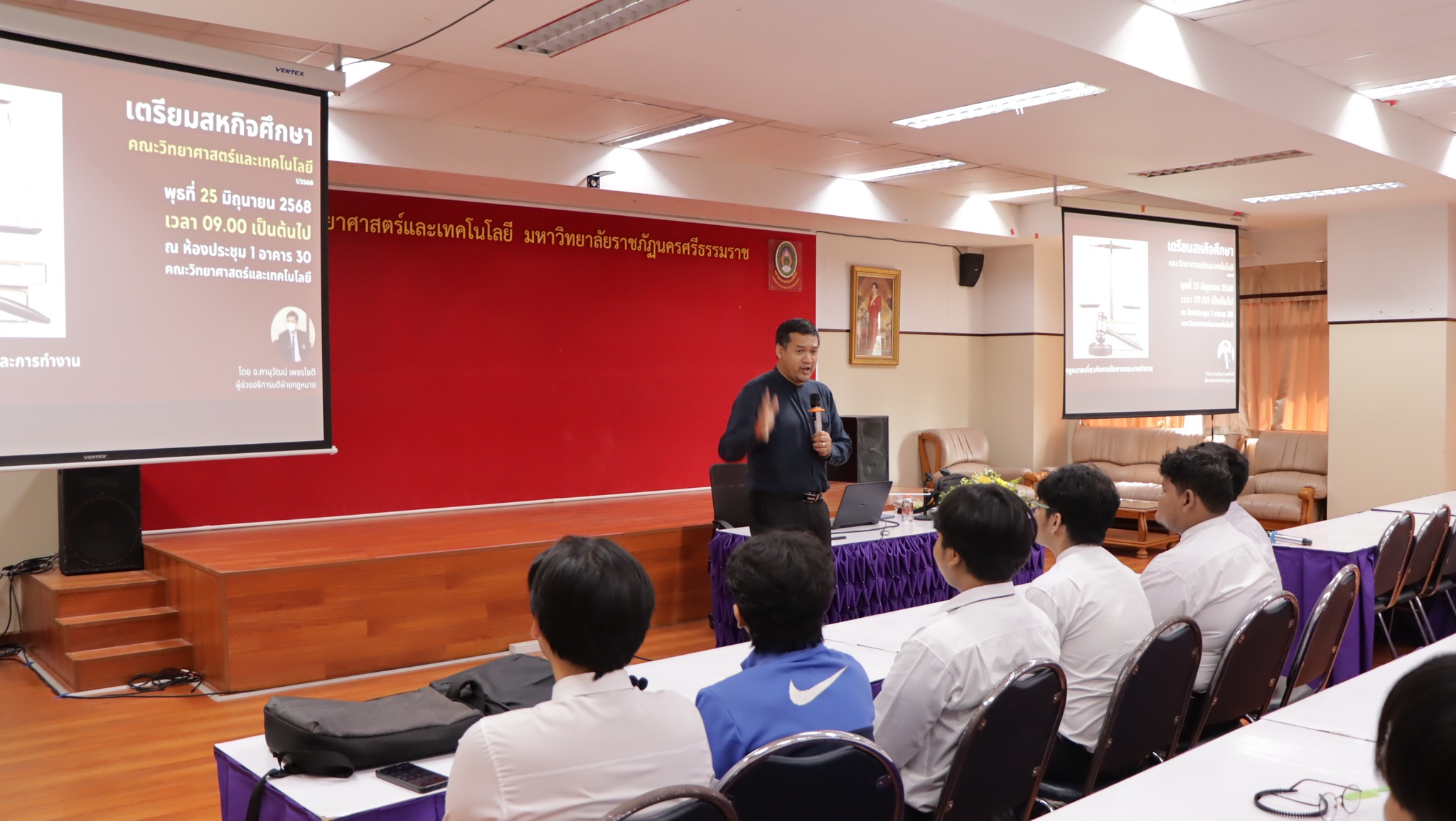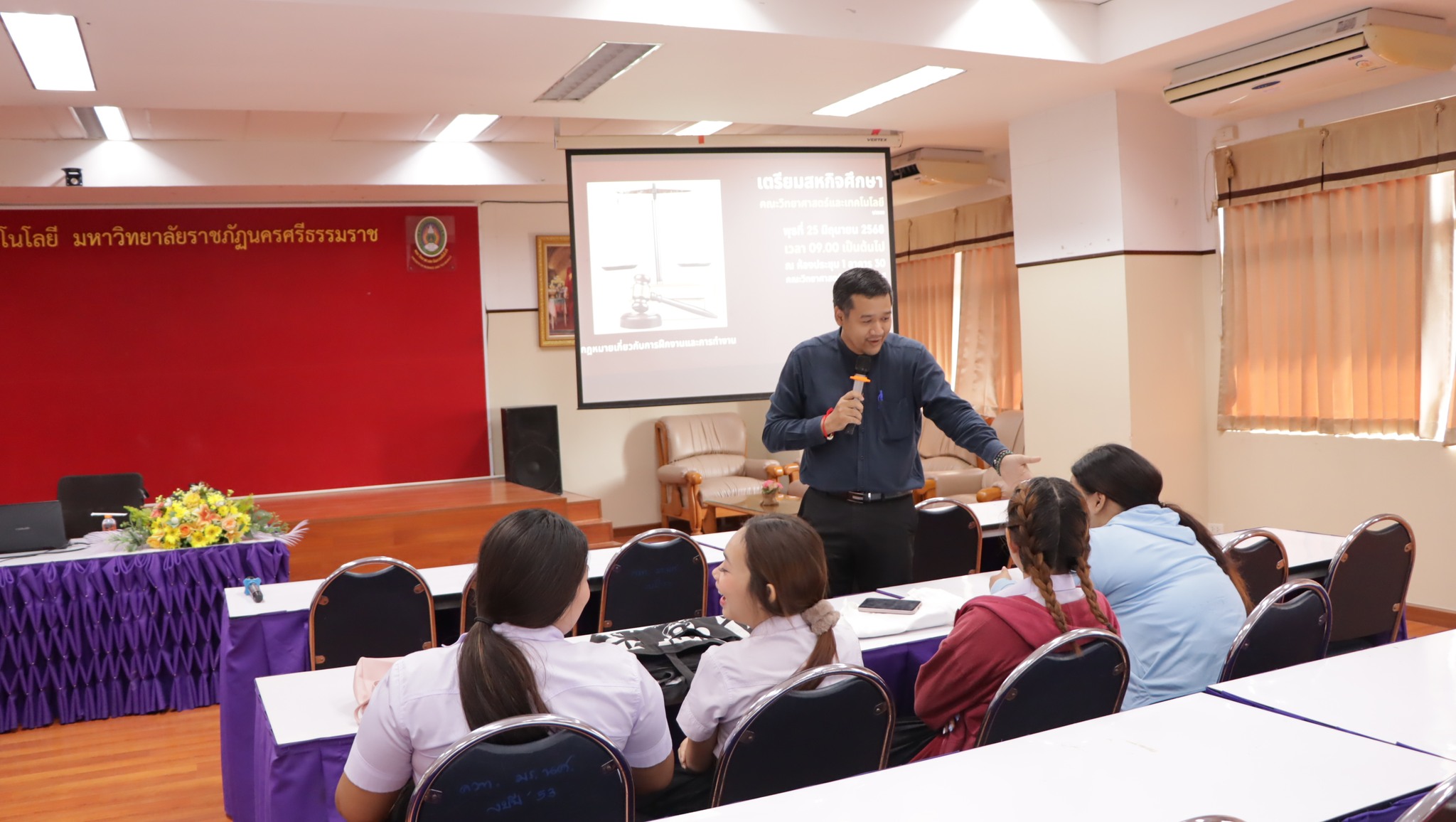 วันพุธที่ 25 มิถุนายน พ.ศ. 2568 คณะวิทยาศาสตร์และเทคโนโลยี มหาวิทยาลัยราชภัฏนครศรีธรรมราช จัดกิจกรรมเตรียมฝึกสหกิจศึกษา ประจำปีการศึกษา 1-2568 ครั้งที่ 2 ในหัวข้อกฎหมายเกี่ยวกับการฝึกงานและการทำงาน โดยได้รับเกียรติจาก อาจารย์ภานุวัฒน์ เพชรโชติ จากสาขาวิชานิติศาสตร์ คณะมนุษยศาสตร์และสังคมศาสตร์ เป็นวิทยากรในเรื่องดังกล่าว กิจกรรมเตรียมฝึกสหกิจศึกษาเป็นโครงการดี ๆ ที่คณะฯ ได้ดำเนินการมาอย่างต่อเนื่อง เพื่อพัฒนาคุณภาพนักศึกษาให้มีความพร้อมสำหรับการออกไปฝึกประสบการณ์ และเสริมสร้างความมั่นใจให้นักศึกษาสามารถออกไปฝึกประสบการณ์สหกิจศึกษาได้อย่างมีประสิทธิภาพ