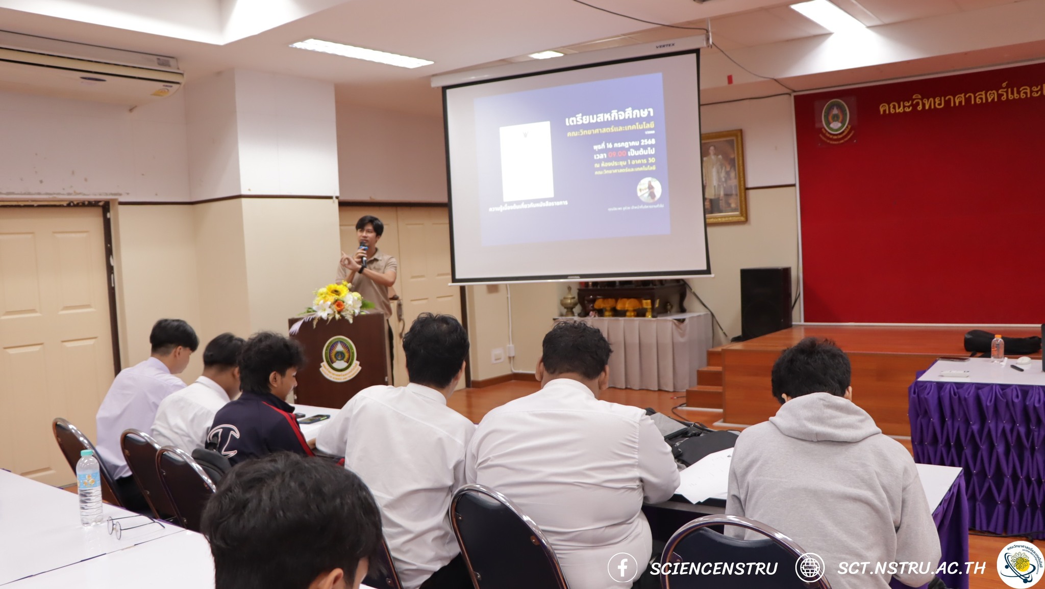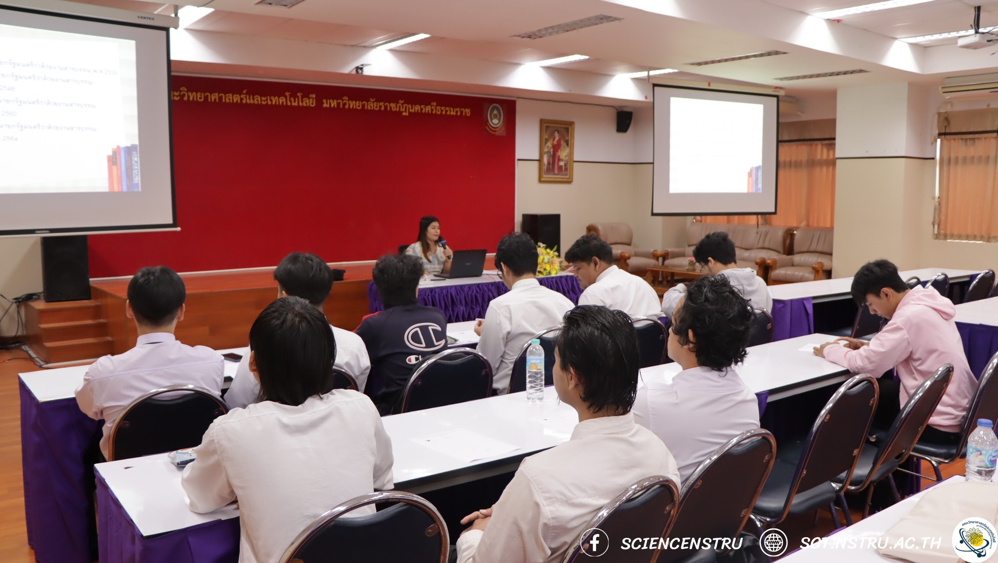 วันพุธที่ 16 กรกฎาคม พ.ศ. 2568 คณะวิทยาศาสตร์และเทคโนโลยี มหาวิทยาลัยราชภัฏนครศรีธรรมราช จัดกิจกรรมเตรียมฝึกสหกิจศึกษา ปีการศึกษา 1/2568 ในหัวข้อ ความรู้เบื้องต้นเกี่ยวกับหนังสือราชการ โดยมีคุณปิยะพร ชูช่วย เจ้าหน้าที่บริหารงานทั่วไป เป็นวิทยากรในการบรรยายดังกล่าว กิจกรรมเตรียมฝึกสหกิจศึกษาเป็นโครงการดี ๆ ที่คณะวิทยาศาสตร์และเทคโนโลยีได้ดำเนินการมาอย่างต่อเนื่อง เพื่อพัฒนาคุณภาพนักศึกษาให้มีความพร้อมสำหรับการออกไปฝึกประสบการณ์ และเสริมสร้างความมั่นใจให้นักศึกษาสามารถออกไปฝึกประสบการณ์สหกิจศึกษาได้อย่างมีประสิทธิภาพ จึงทำให้การจัดกิจกรรมในครั้งนี้นักศึกษาได้รับความรู้เป็นอย่างมาก