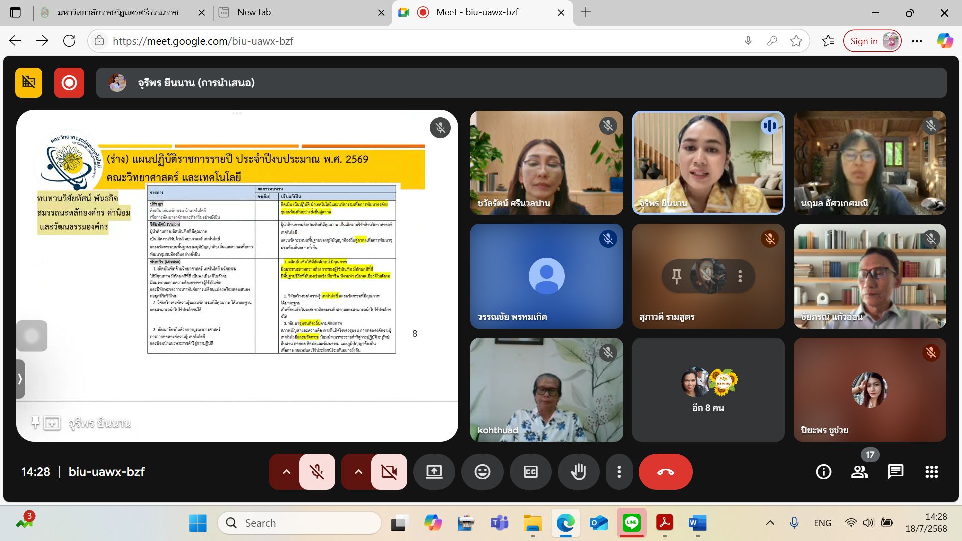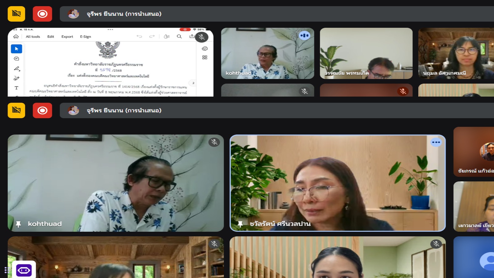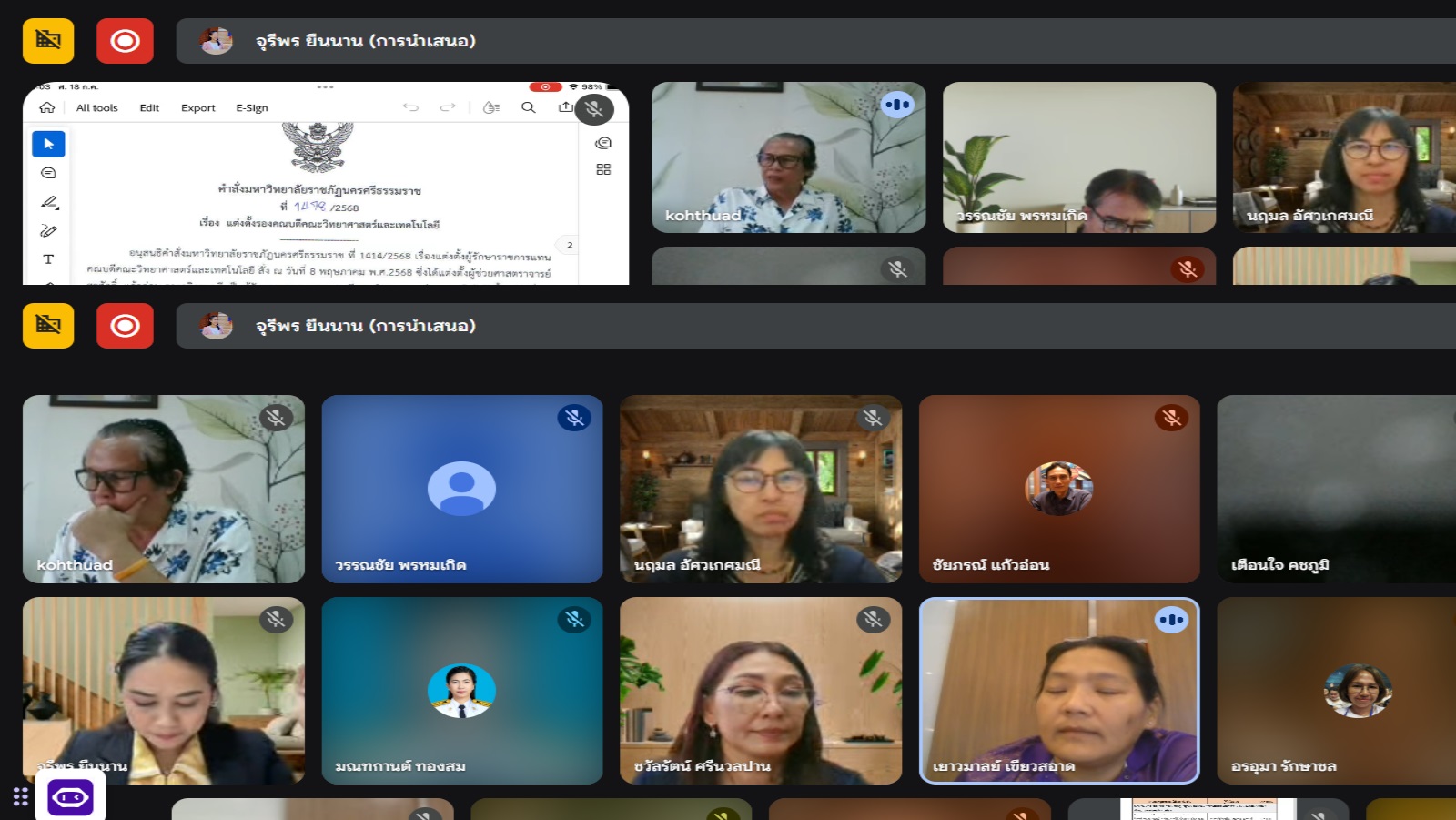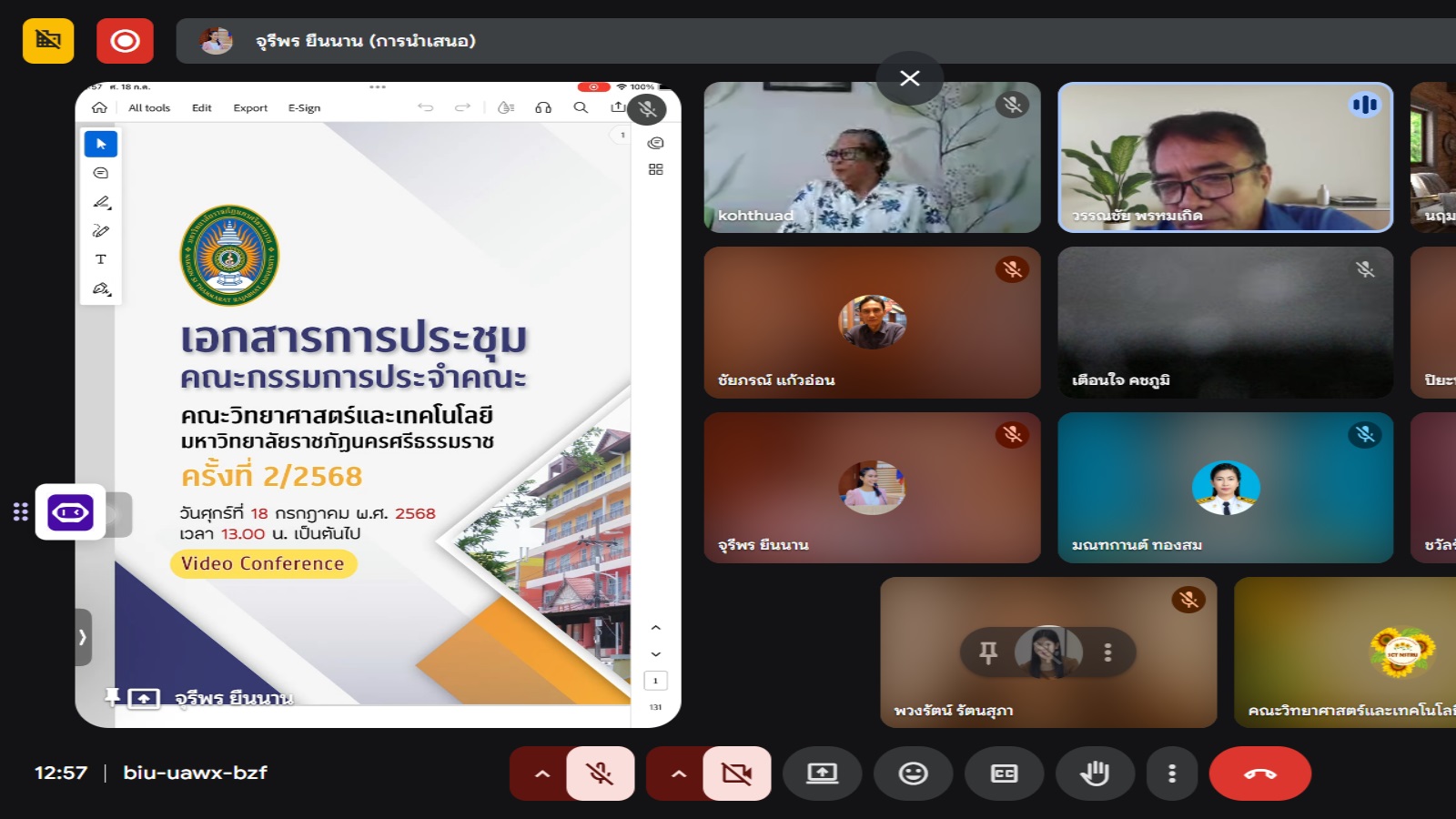 วันศุกร์ที่ 18 กรกฎาคม 2568 ที่ผ่านมา คณะวิทยาศาสตร์และเทคโนโลยี มหาวิทยาลัยราชภัฏนครศรีธรรมราช จัดประชุมคณะกรรมการประจําคณะวิทยาศาสตร์และเทคโนโลยี โดยมีวาระสำคัญเพื่อพิจารณา เรื่องให้ความเห็นชอบ (ร่าง) แผนปฏิบัติราชการ ประจําปีงบประมาณ พ.ศ.2569 ให้ความเห็นชอบการปิดหลักสูตรวิทยาศาสตรบัณฑิต สาขาวิชาเคมี และให้ความเห็นชอบแผนพัฒนาหลักสูตรวิทยาศาสตรบัณฑิต สาขาวิชาเทคโนโลยีการประมง รูปแบบออนไลน์