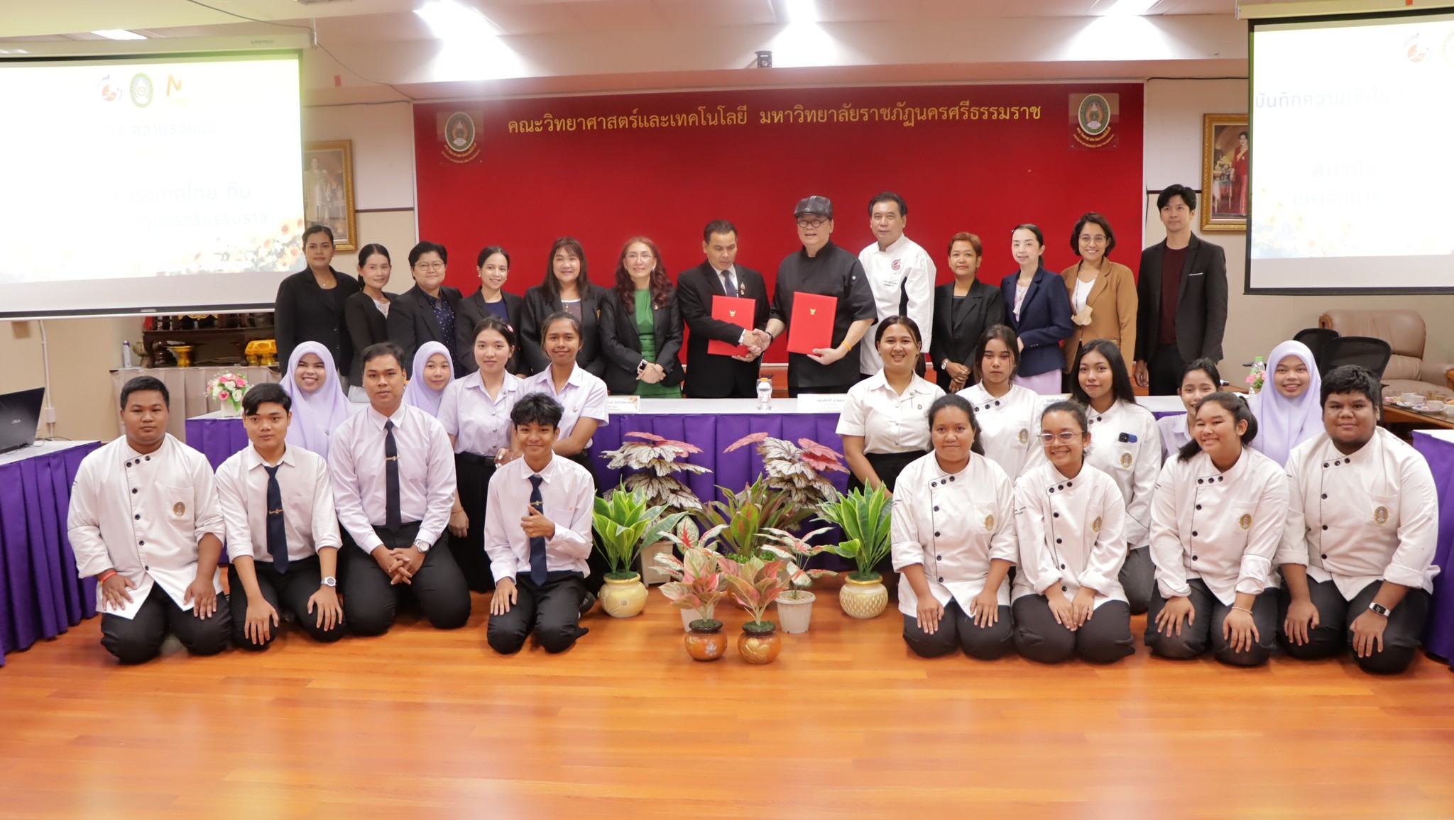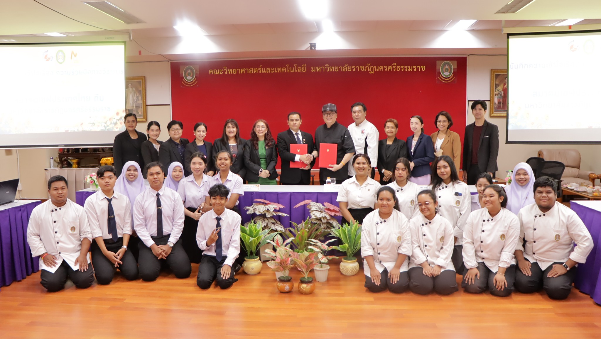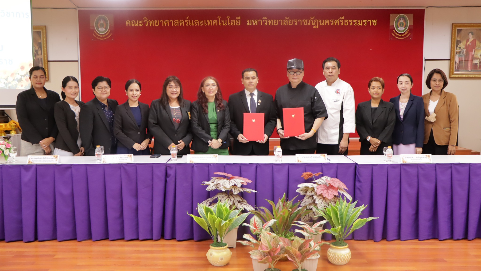 วันที่ 26 มีนาคม 2568 หลักสูตรวิทยาศาสตรบัณฑิต สาขาวิชาวิทยาการการประกอบอาหาร คณะวิทยาศาสตร์และเทคโนโลยี มหาวิทยาลัยราชภัฏนครศรีธรรมราช ร่วมกับ สมาคมเชฟประเทศไทย สร้างความร่วมมือการพัฒนาผู้เรียนด้านวิชาการ การเรียนการสอน การวิจัย การบริการวิชาการแก่สังคม และกิจกรรมพัฒนานักศึกษาสาขาวิชาวิทยาการการประกอบอาหาร ในการนี้ ดร.สมปอง รักษาธรรม รักษาราชการแทนอธิการบดีมหาวิทยาลัยราชภัฏนครศรีธรรมราช มอบหมายให้ ผู้ช่วยศาสตราจารย์ ดร.ดำรงศ์พันธ์ ใจห้าววีระพงศ์ รองอธิการบดี ฝ่ายพัฒนาท้องถิ่น การเงินและบัญชี ร่วมลงนามในบันทึกความเข้าใจเรื่องความมือทางวิชาการฯ ของสาขาวิชาวิทยาการการประกอบอาหาร คณะวิทยาศาสตร์และเทคโนโลยี กับ สมาคมเชฟประเทศไทย ซึ่งมีคุณสมศักดิ์ รารองคำ นายกสมาคมเชฟประเทศไทย และคุณประชัน วงศ์อุทัยพันธุ์ คณะกรรมการบริหาร สมาคมเชฟประเทศไทยให้เกียรติเดินทางมาร่วมลงนามในบันทึกบันทึกความร่วมมือทางวิชาการฯ ในครั้งนี้ด้วย
