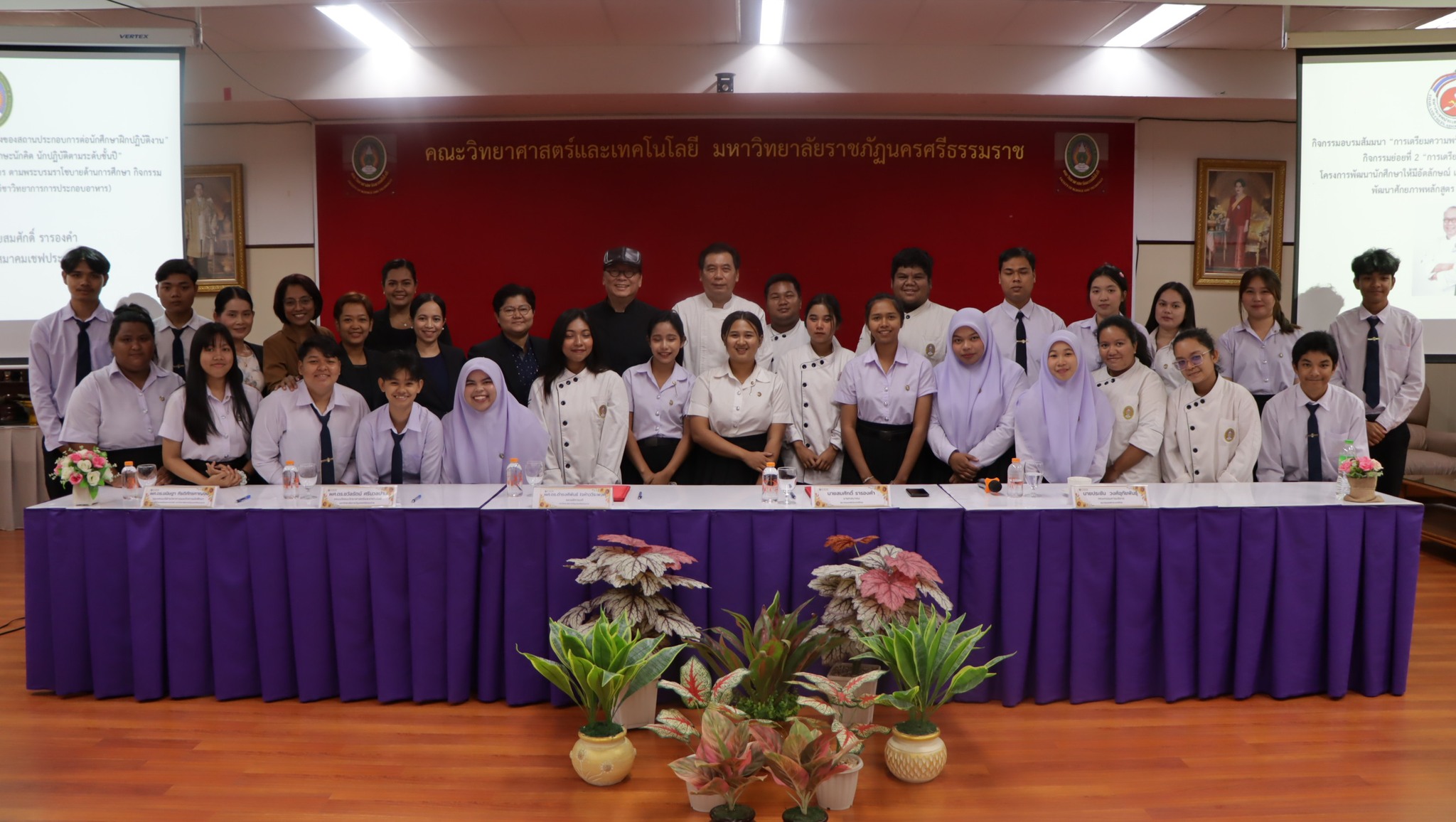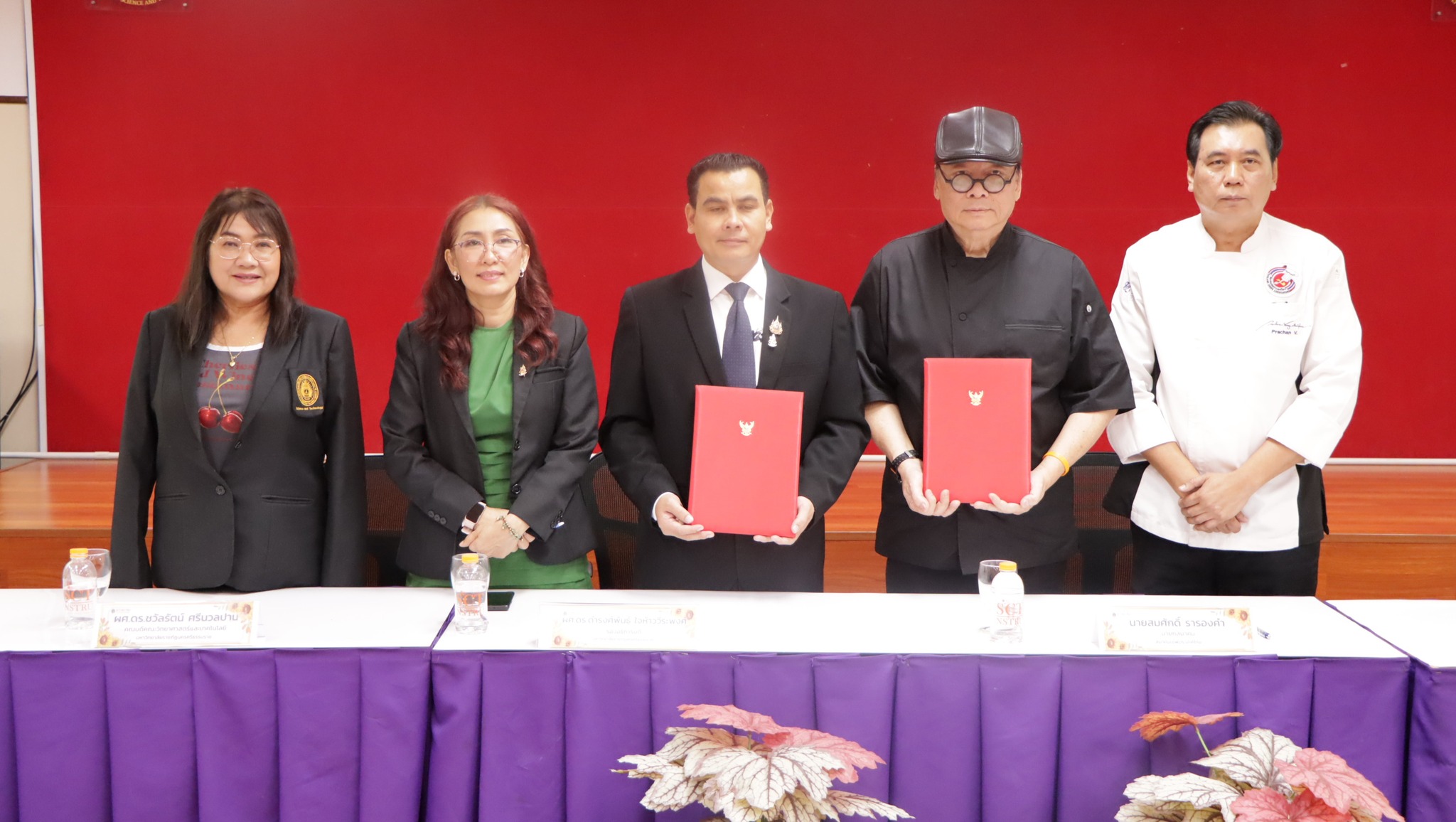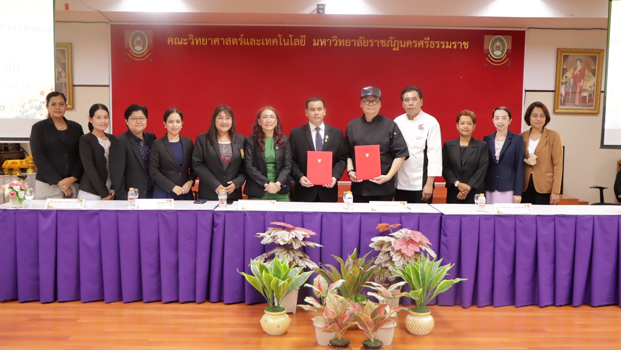 วันที่ 26 มีนาคม 2568 หลักสูตรวิทยาศาสตรบัณฑิต สาขาวิชาวิทยาการการประกอบอาหาร คณะวิทยาศาสตร์และเทคโนโลยี มหาวิทยาลัยราชภัฏนครศรีธรรมราช ร่วมกับ สมาคมเชฟประเทศไทย สร้างความร่วมมือการพัฒนาผู้เรียนด้านวิชาการ การเรียนการสอน การวิจัย การบริการวิชาการแก่สังคม และกิจกรรมพัฒนานักศึกษาสาขาวิชาวิทยาการการประกอบอาหาร ในการนี้ ดร.สมปอง รักษาธรรม รักษาราชการแทนอธิการบดีมหาวิทยาลัยราชภัฏนครศรีธรรมราช มอบหมายให้ ผู้ช่วยศาสตราจารย์ ดร.ดำรงศ์พันธ์ ใจห้าววีระพงศ์ รองอธิการบดี ฝ่ายพัฒนาท้องถิ่น การเงินและบัญชี ร่วมลงนามในบันทึกความเข้าใจเรื่องความมือทางวิชาการฯ ของสาขาวิชาวิทยาการการประกอบอาหาร คณะวิทยาศาสตร์และเทคโนโลยี กับ สมาคมเชฟประเทศไทย ซึ่งมีคุณสมศักดิ์ รารองคำ นายกสมาคมเชฟประเทศไทย และคุณประชัน วงศ์อุทัยพันธุ์ คณะกรรมการบริหาร สมาคมเชฟประเทศไทยให้เกียรติเดินทางมาร่วมลงนามในบันทึกบันทึกความร่วมมือทางวิชาการฯ ในครั้งนี้ด้วย