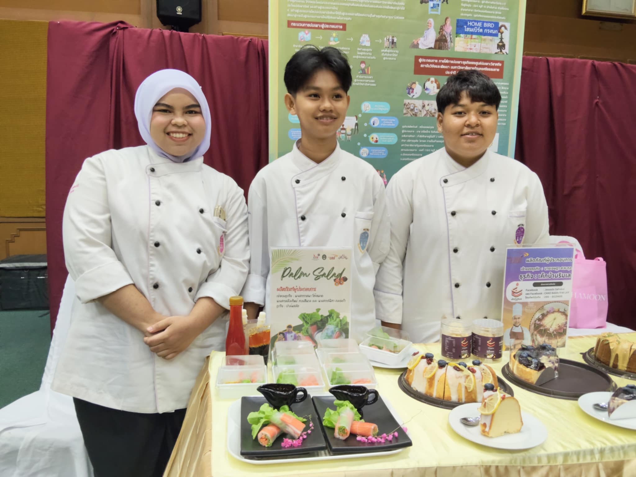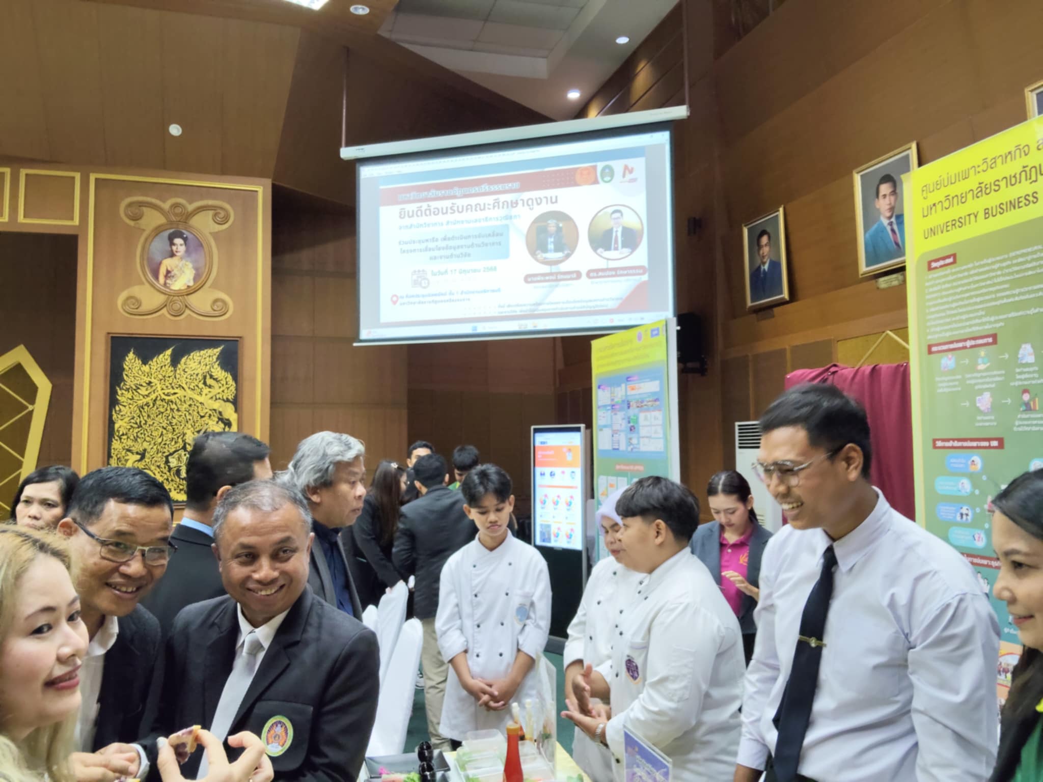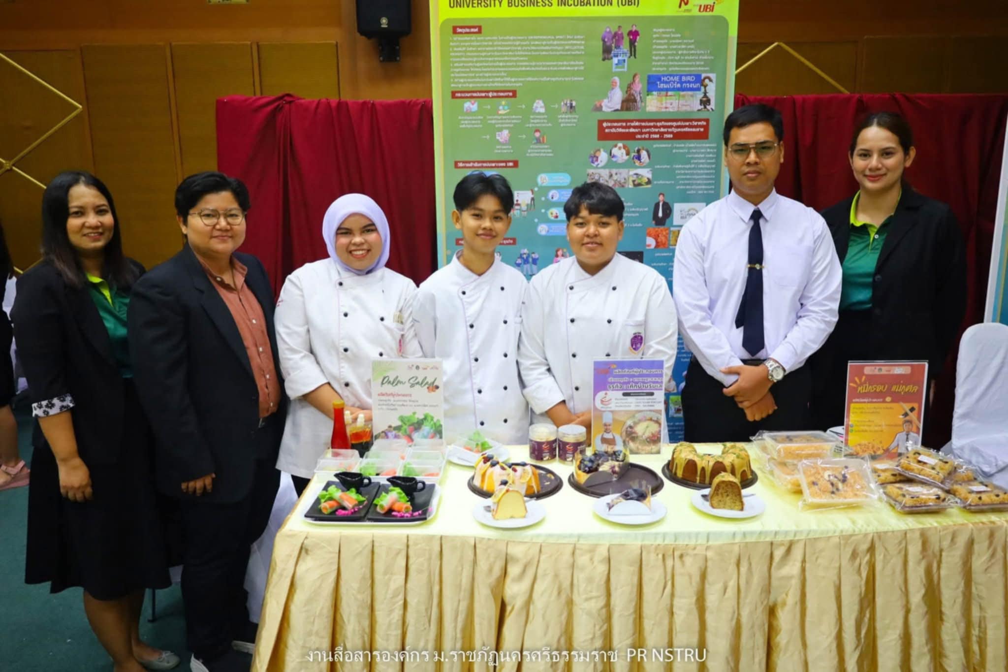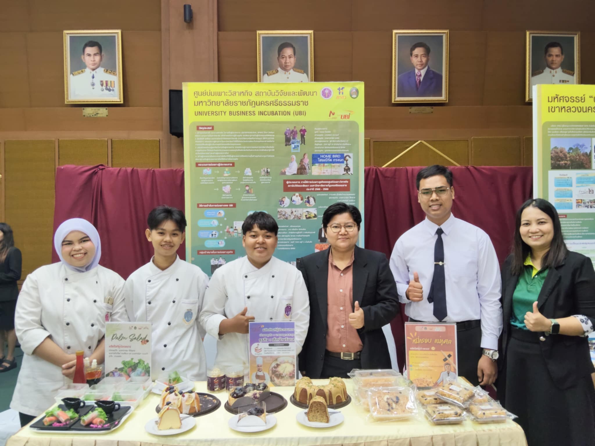วันอังคารที่ 17 มิถุนายน 2568 นักศึกษาสาขาวิชาวิทยาการการประกอบอาหาร ชั้นปีที่ 3 คณะวิทยาศาสตร์และเทคโนโลยี มหาวิทยาลัยราชภัฏนครศรีธรรมราช ประกอบด้วย นายเจษฎา สหกุล (เจ้าของธุรกิจเค้กบ้านริมเล) นางสาววาสนา โต๊ะหมาด นางสาวสลิลทิพย์ ทองสีนวล และนางสาวชนิตา คลองรั้ว (เจ้าของธุรกิจปาล์มสลัด) ซึ่งอยู่ภายใต้การบ่มเพาะธุรกิจกับหน่วยบ่มเพาะวิสาหกิจ มหาวิทยาลัยราชภัฏนครศรีธรรมราช ได้เข้าร่วมกิจกรรมต้อนรับคณะศึกษาดูงานจากสำนักวิชาการ สำนักงานเลขาธิการวุฒิสภา พร้อมกันนี้นักศึกษาได้เข้าร่วมการประชุมหารือเพื่อเตรียมความพร้อมตามโครงการเชื่อมโยงข้อมูลผลงานด้านวิชาการและงานวิจัย ซึ่งจัดขึ้น ณ ห้องประชุมนิลพยัคฆ์ ชั้น 1 สำนักงานอธิการบดี มหาวิทยาลัยราชภัฏนครศรีธรรมราช โดยมีวัตถุประสงค์เพื่อส่งเสริมความร่วมมือระหว่างหน่วยงานภายนอกและมหาวิทยาลัยในการพัฒนางานวิจัย งานวิชาการ ตลอดจนสนับสนุนการบ่มเพาะธุรกิจของนักศึกษาให้มีความเข้มแข็งและสามารถขยายผลสู่เชิงพาณิชย์ได้ในอนาคต
