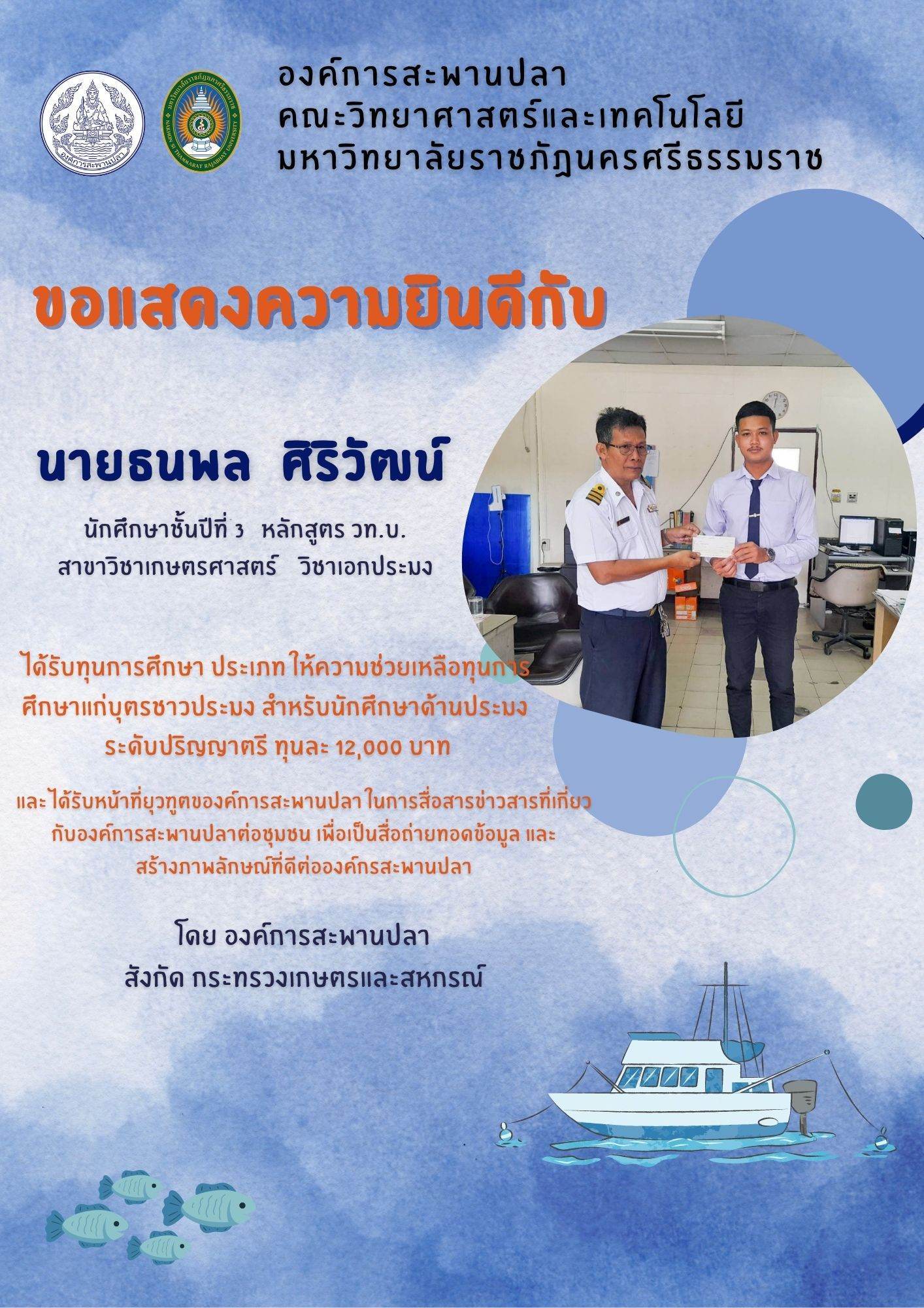 ขอแสดงความยินดี นายธนพล ศิริวัฒน์ นักศึกษาชั้นปีที่ 3 หลักสูตรวิทยาศาสตรบัณฑิต สาขาวิชาเกษตรศาสตร์ วิชาเอกประมง