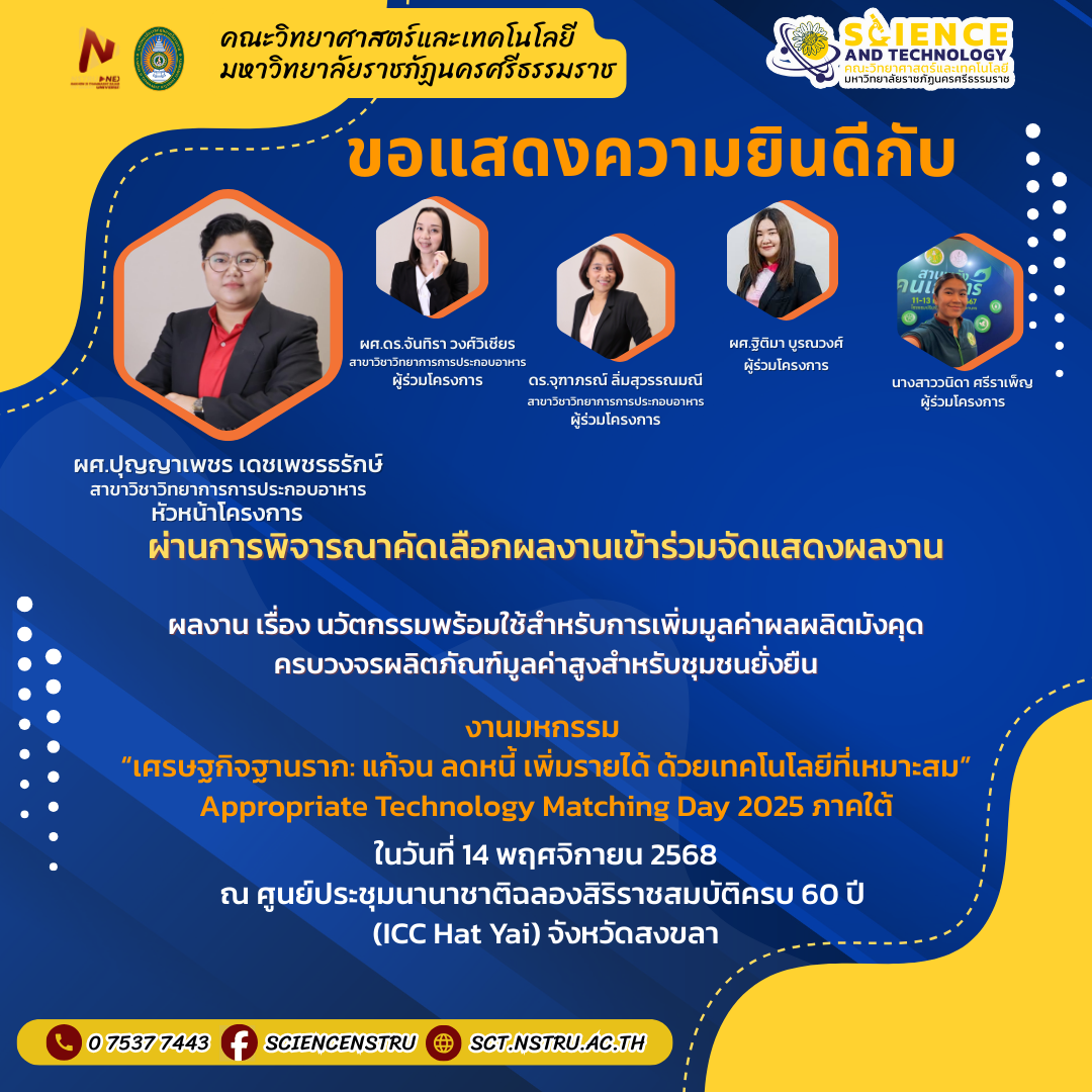 ขอแสดงความยินดีกับคณาจารย์ผ่านการพิจารณาคัดเลือกผลงานเข้าร่วมจัดแสดงผลงาน Appropriate Technology Matching Day 2025