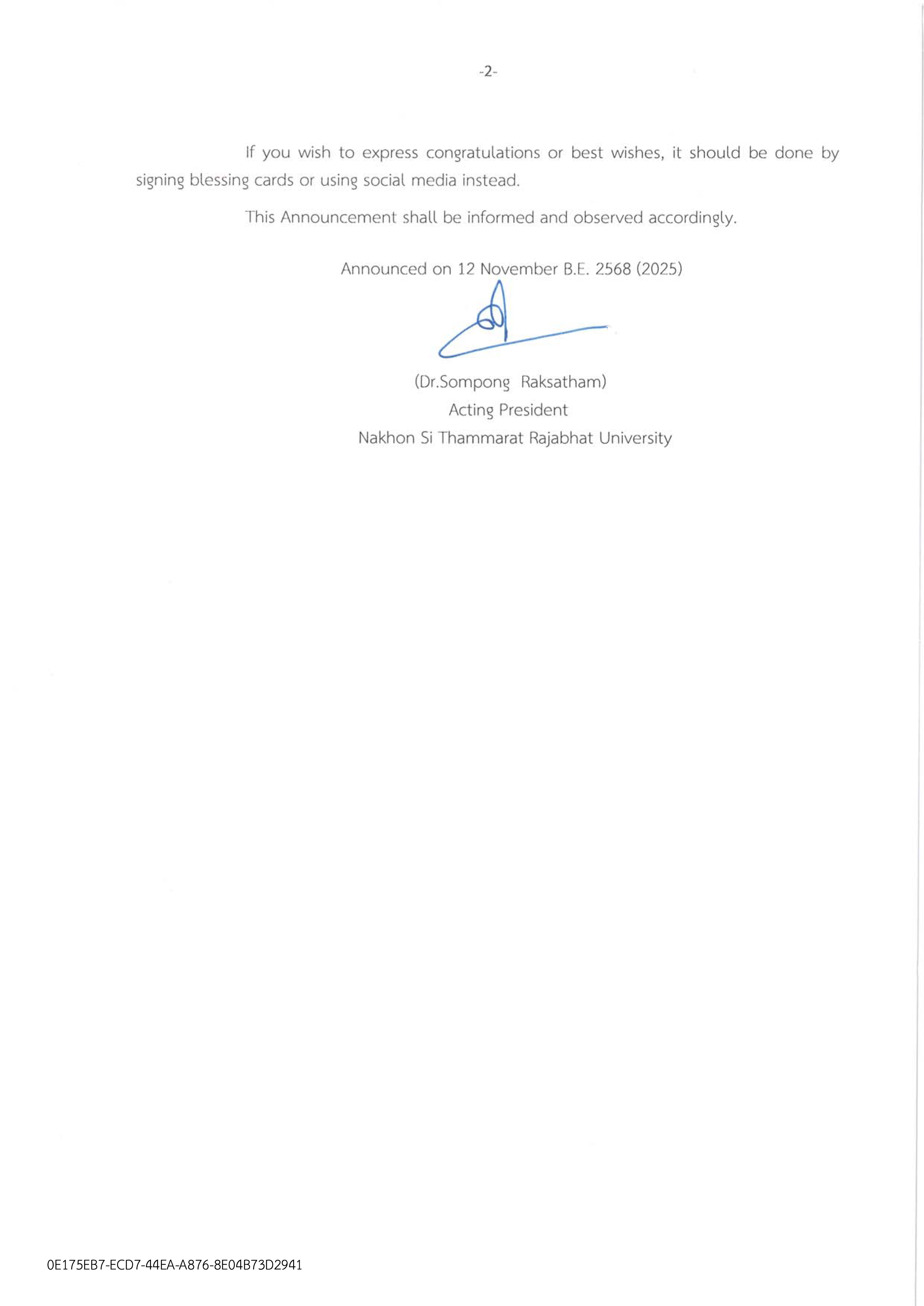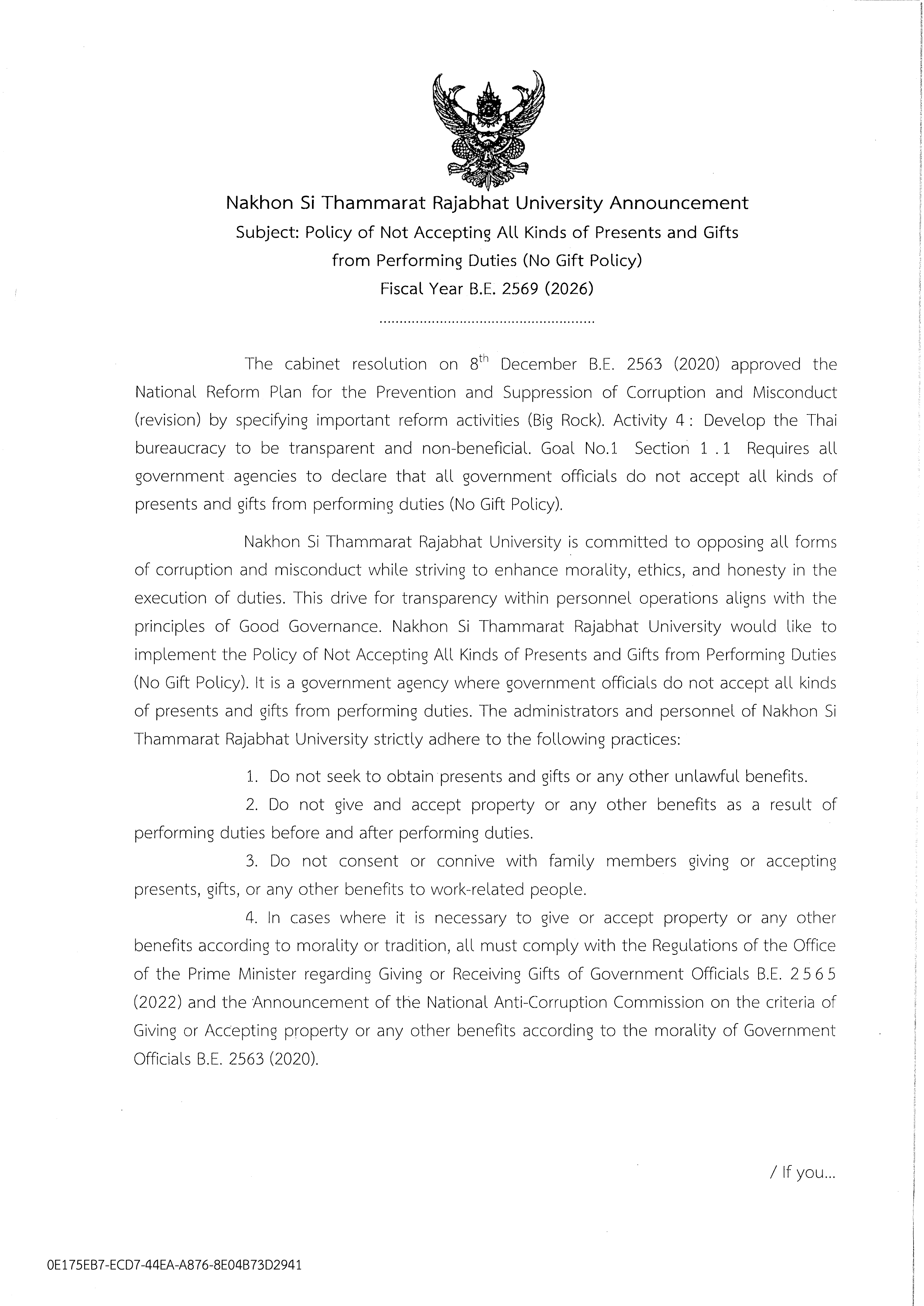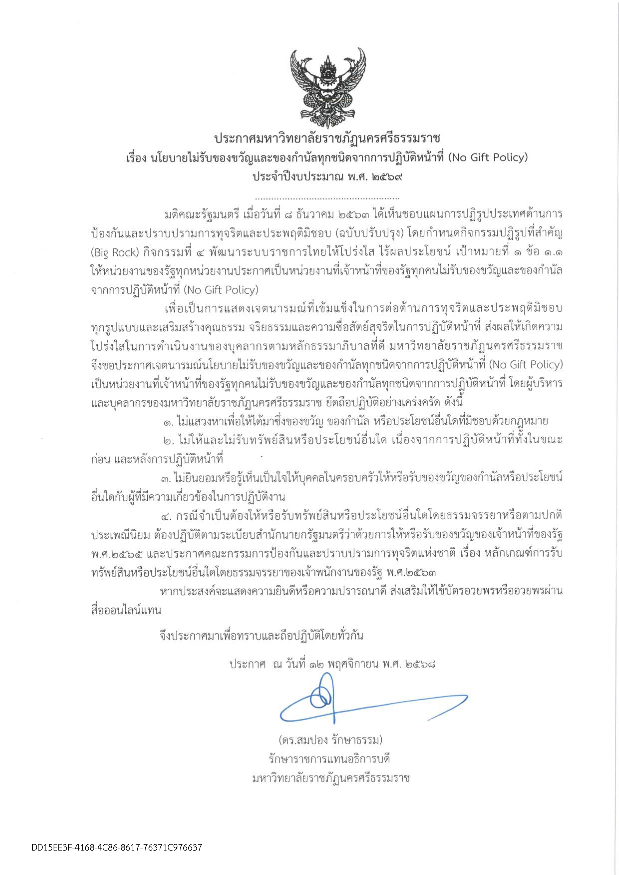 นโยบายไม่รับของขวัญและของกำนัลทุกชนิดจากการปฏิบัติหน้าที่ No Gift Policy ประจำปีงบประมาณ พ.ศ. 2569