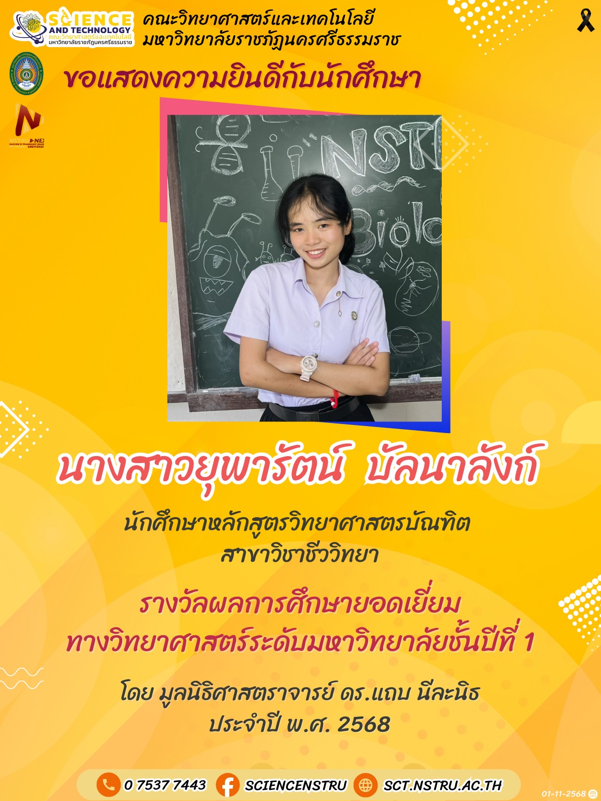 นักศึกษาได้รับรางวัลผลการศึกษายอดเยี่ยมทางวิทยาศาสตร์ระดับมหาวิทยาลัยชั้นปีที่ 1