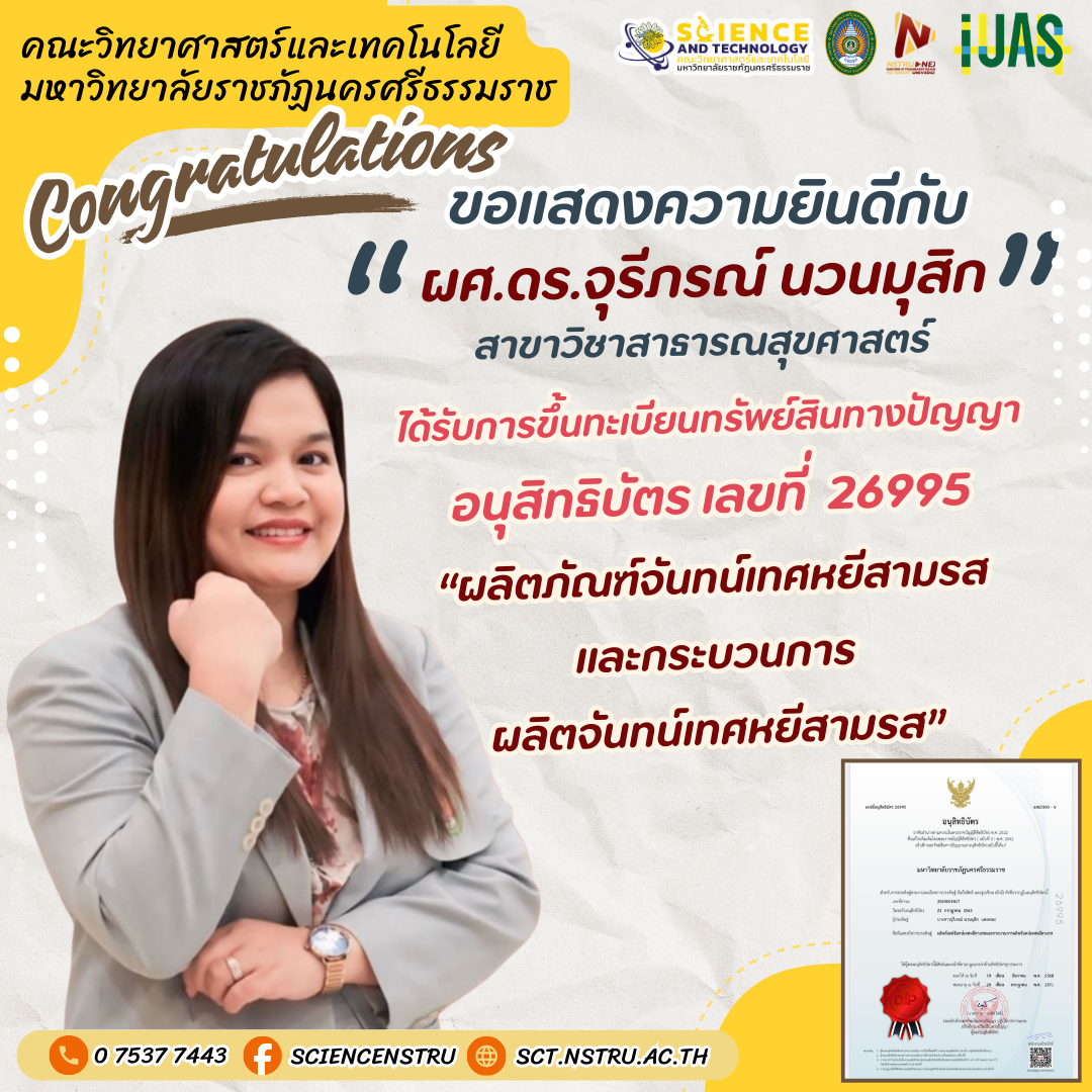ผศ.ดร.จุรีภรณ์ นวนมุสิก สาขาวิชาสาธารณสุขศาสตร์ ได้รับการขึ้นทะเบียนทรัพย์สินทางปัญญา