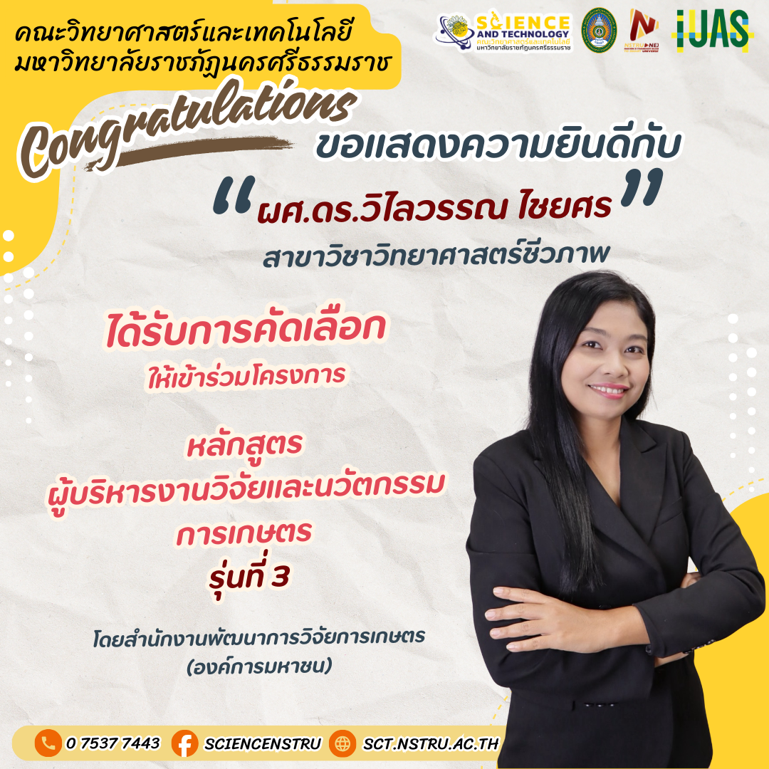 ได้รับการคัดเลือกให้เข้าร่วมโครงการหลักสูตรผู้บริหารงานวิจัยและนวัตกรรมการเกษตร รุ่นที่ 3 โดยสำนักงานพัฒนาการวิจัยการเกษตร (องค์การมหาชน)