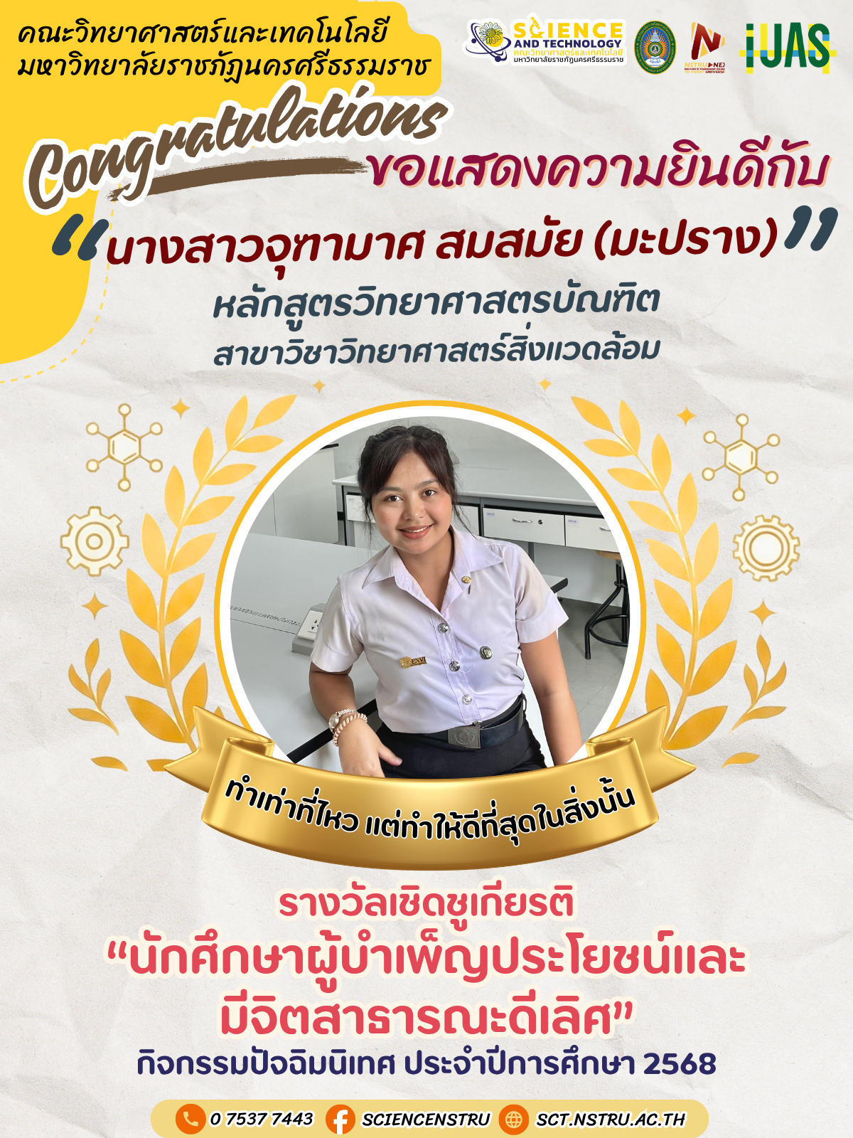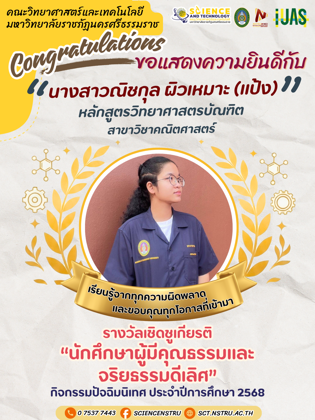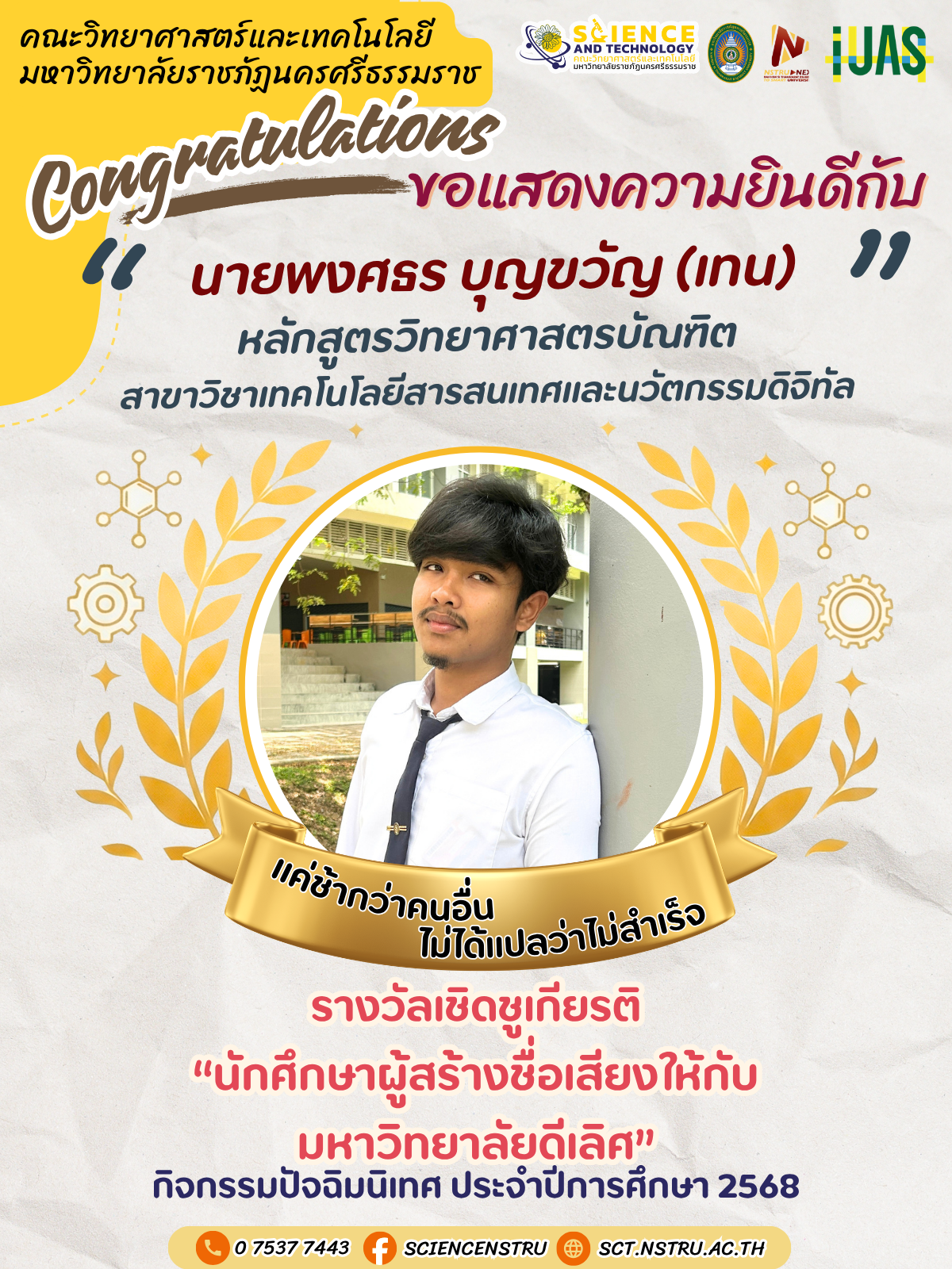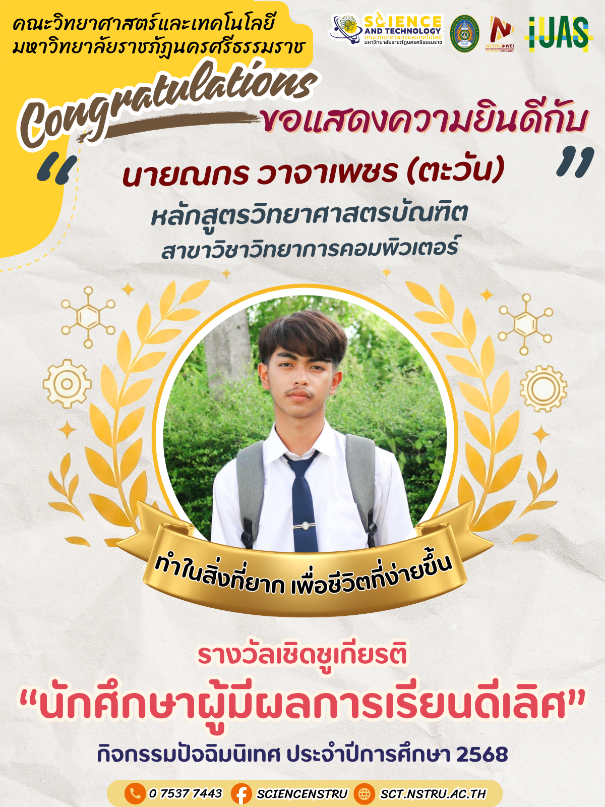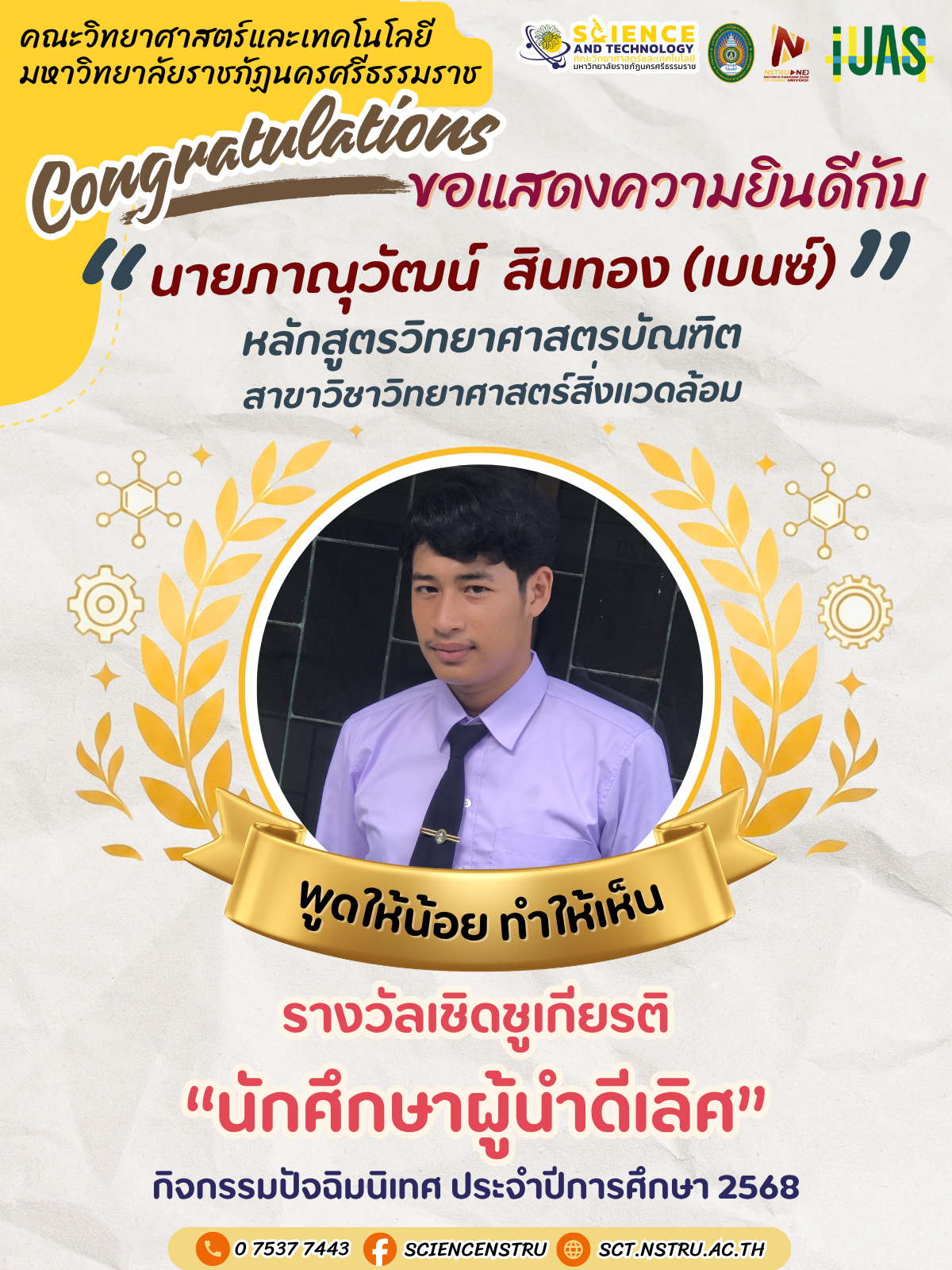 ขอแสดงความยินดีกับนักศึกษา ที่ได้รับรางวัลเชิดชูเกียรตินักศึกษาดีเลิศ