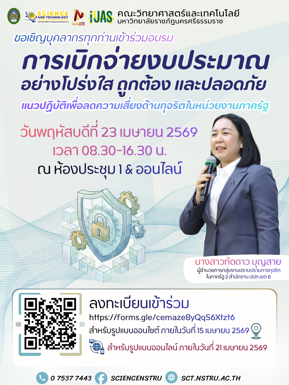 ขอเชิญบุคลากรเข้าร่วมอบรมการเบิกจ่ายงบประมาณอย่างโปร่งใส ถูกต้อง และปลอดภัย : แนวปฏิบัติเพื่อลดความเสี่ยงด้านทุจริตในหน่วยงานภาครัฐ