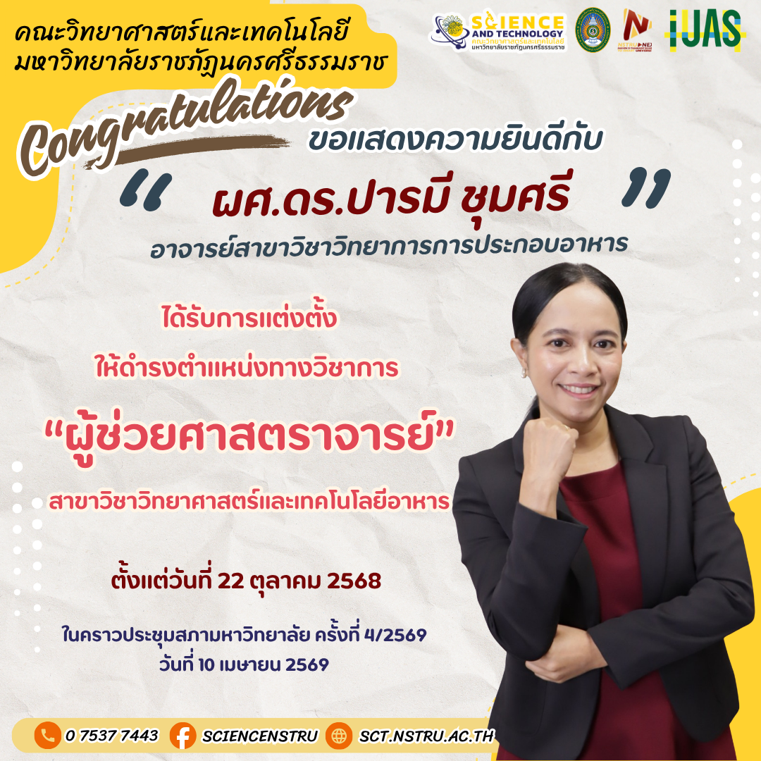 อาจารย์สาขาวิชาวิทยาการการประกอบอาหาร ได้รับการแต่งตั้ง ให้ดำรงตำแหน่งทางวิชาการ ผู้ช่วยศาสตราจารย์